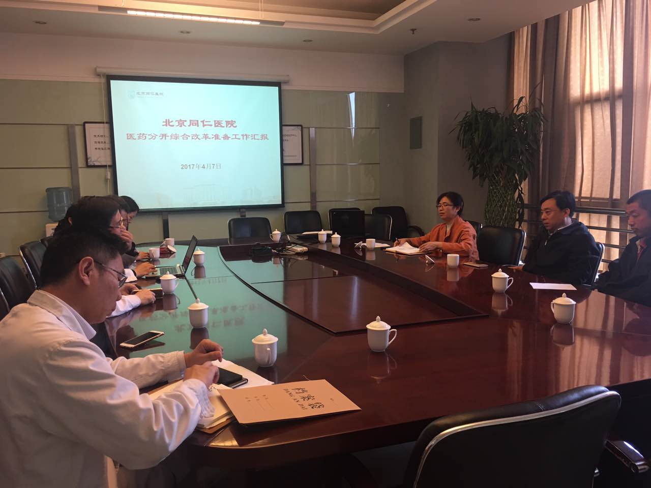 在第一会议室,院长助理吴明营首先向开发区管委会领导表达了我院领导和全体职工对此次医改工作的重视,以及顺利完成医改任务的决心,并向领导汇报了我院结合实际情况,先后组织多次培训和演练,对医改的启动和系统切换进行了充分准备。随后,公共事务部马佳临主任就我院医改准备工作进行了详细汇报。