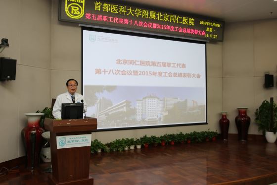 会上,伍冀湘院长做题为《汇聚同仁力量,共筑金色品牌》的2015年度同仁医院工作报告。报告中伍院长围绕开展医疗服务年活动,深化医疗服务内涵;全面加强科教发展,打造立体化人才学科平台;牢记医院使命担当,全力做好各项保障任务;加强精细化管理,促进医院可持续健康发展;主动适应未来发展方向,稳步推进医改纵深发展;加强基础建设工作,保障医院运行平稳有序;紧密围绕中心工作,党政工团齐抓共管形成合力等方面回顾了医院2015年各项工作。在肯定2015年工作的同时针对南区二期扩建工程推进;关注医疗质量和医疗服务;人才培养和学科建设与医院未来发展的关系;推进公立医院改革进程中继续坚持公益性;发挥信息系统在临床和管理工作中的重要支撑作用;重视医务人员医学人文精神的培养几方面分析了当前面临的形势与困难。报告最后,伍院长对2016年“同仁医院学术年”工作重点进行阐述。从开展同仁学术年活动,促进医院内涵式发展;围绕同仁论坛主线开展130周年院庆纪念活动;着重开展人才团队引进,努力打造学科建设;深化分级诊疗工作,探索医疗联合体试点;大力推进非急诊挂号全面预约工作;夯实教育教学能力,迎接首医临床技能大赛;实现三区信息系统一体化,发挥信息支撑作用;全面推进南区扩建工程项目进展;做好干部换届收尾工作,提高干部素质和能力;全力做好第二十五批援几内亚医疗队保障工作;明确医院发展定位,科学制定“十三五”规划共11个方面展开。伍院长强调2016年是“十三五”规划的开局之年,是推动同仁医院发展与改革的关键一年,全院干部职工要继续统一思想,同心同德,扎实工作,锐意进取,做好各项重点工作。