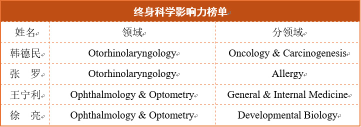 在“终身科学影响力排行榜”中,北京同仁医院共有4位学者入选,分别为韩德民、张罗、王宁利、徐亮,体现了他们在长期科研工作中所积累的深远学术影响。