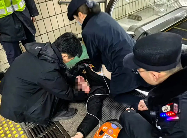 陈彪迅速将患者平置,双膝跪地,双手叠压在他胸廓正中实施胸外按压,并在按压间隙帮助患者开放气道,完成人工呼吸。地铁工作人员与执勤民警拨打120急救电话,并取来站内AED(自动体外除颤仪)。